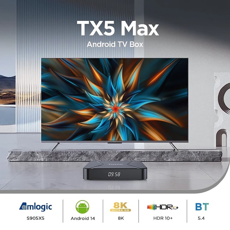 Tanix TX5 Max — это современная смарт ТВ приставка с быстрым процессором, поддержкой Android 14, 4K HDR10+, двумя режимами интерфейса и стабильным Wi-Fi 6. Она отлично подходит для просмотра фильмов, онлайн-ТВ, YouTube, игр и IPTV.