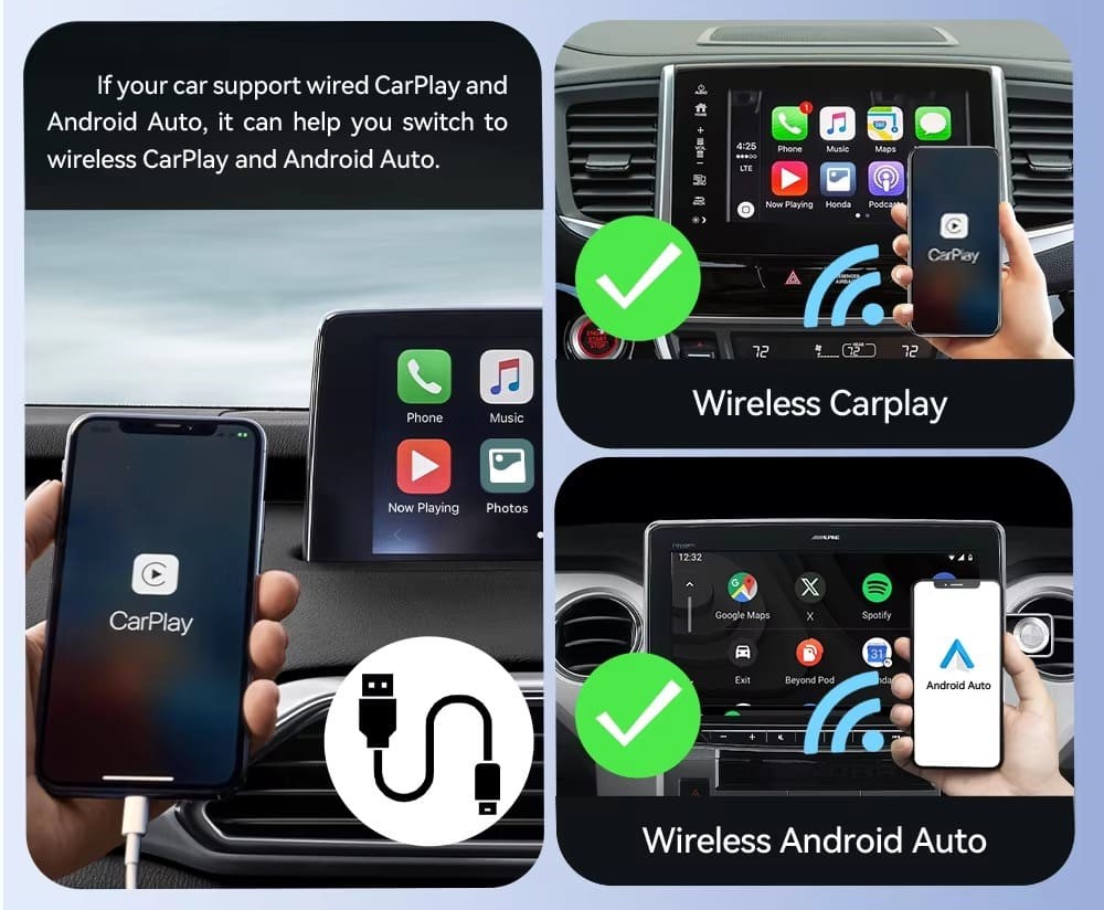 Основна сфера застосування — автомобілі, в яких з заводу є підтримка дротового CarPlay або Android Auto. Адаптер діє як міст: ви підключаєте його в USB-порт, а він "роздає" інтерфейс на ваш смартфон по повітрю.